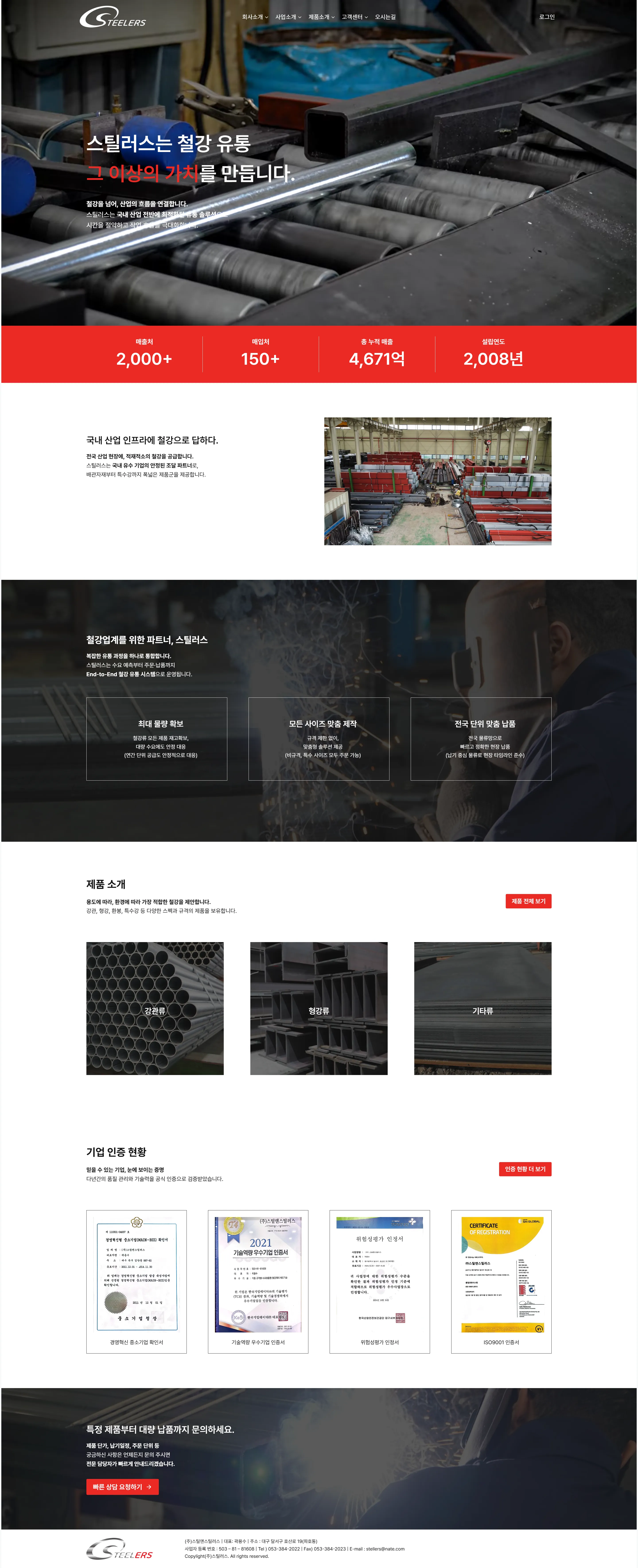 또한, 기업의 신뢰도를 높이기 위해 납품 사례, 파트너 로고, 인증 정보를 시각적으로 배치했고,
